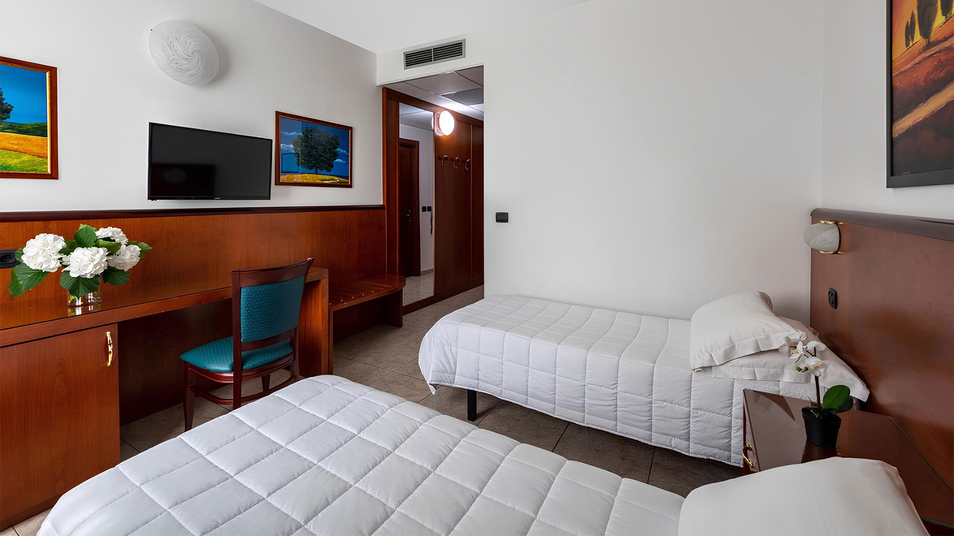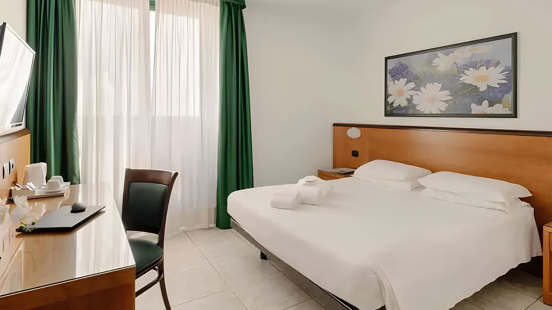 Mit einem Doppelbett und einem Einzelbett bietet es eine elegante und komfortable Umgebung. Enthält kostenloses Wi-Fi, Sky Hotel, Wasser in der Minibar, Zugang zum Fitnessstudio nach Reservierung und kostenloses Parken mit überdachten Parkplätzen nach Verfügbarkeit.